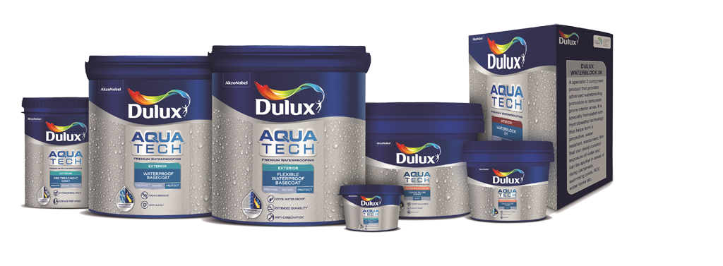 The range of Dulux Aquatech Exterior Basecoats has 2 variants – Flexible Waterproof Basecoat and Standard Waterproof Basecoat. They provide exterior protection against dampness. Dulux Aquatech Flexible Waterproof Basecoat is a high quality premium waterproof coating.